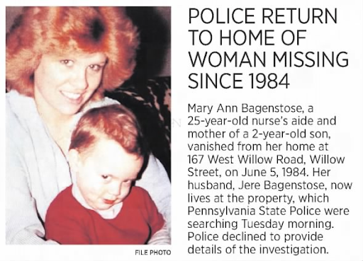 Mary Ann Bagenstose was a 25-year old devoted mother living in Lancaster County and working as a nurse’s aide. On June 5, 1984, Mary Ann informed her mother of plans to go car shopping with her estranged husband, Jere. While waiting for Jere to return from the park with their son Jeremy, Mary Ann presumably walked to Turkey Hill, but never arrived and has not been heard from since.